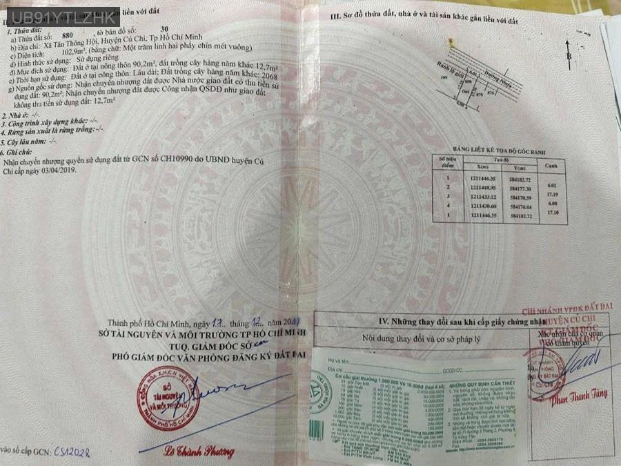 Bán đất mặt tiền đường nhựa Xã Tân Thông Hội, Củ Chi